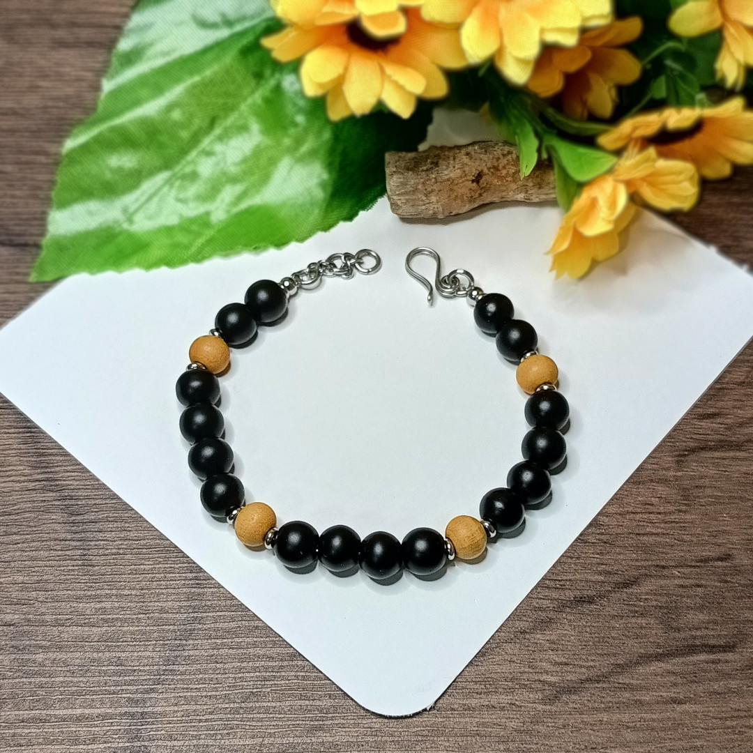 U skladnom nizu mat oniksa i toplog drveta, narukvica nosi mirnu, baršunastu energiju prirodnih materijala. Blaga na dodir i umirujuća na koži, može povremeno poneti kap omiljenog esencijalnog ulja, pretvarajući se u diskretan mirisni talisman.