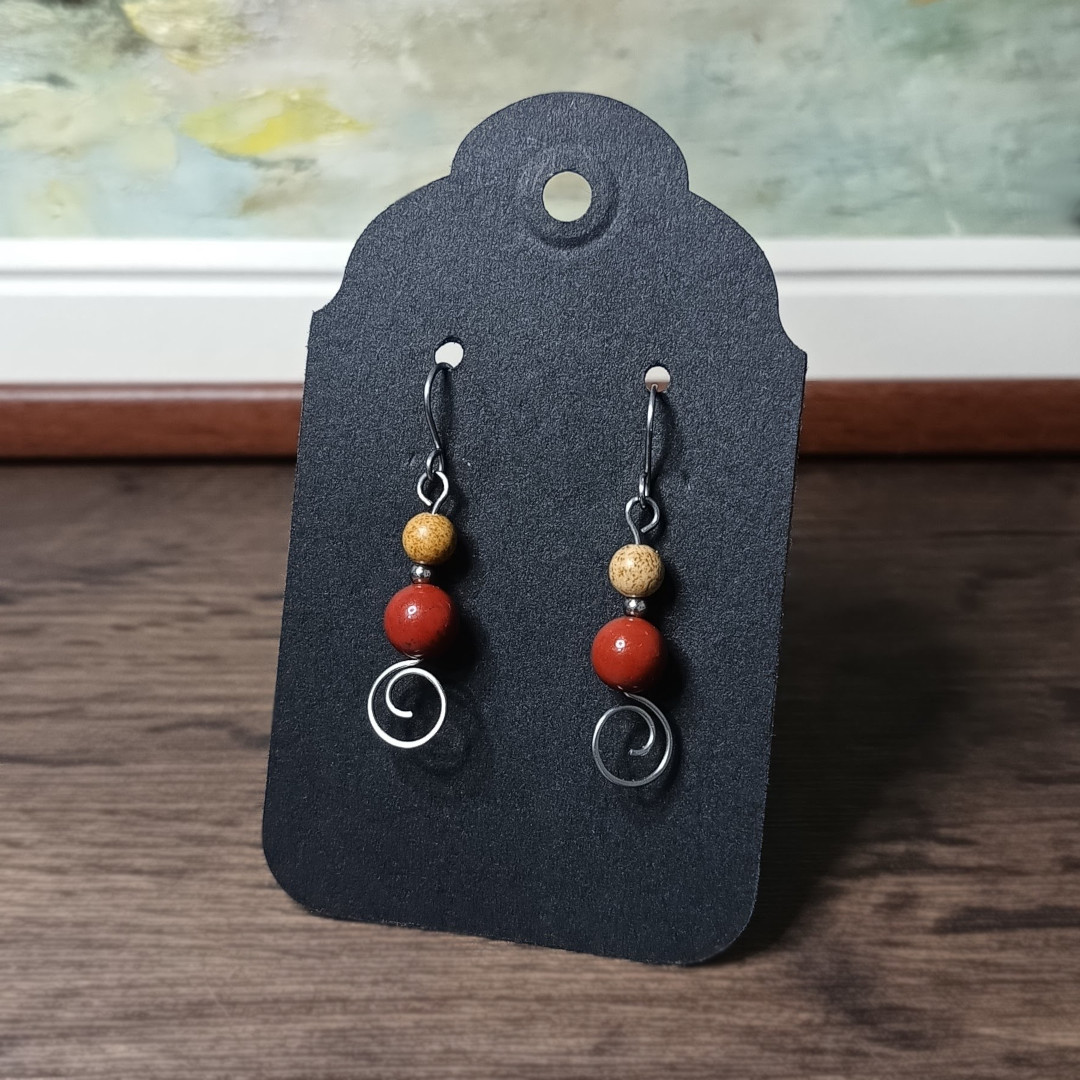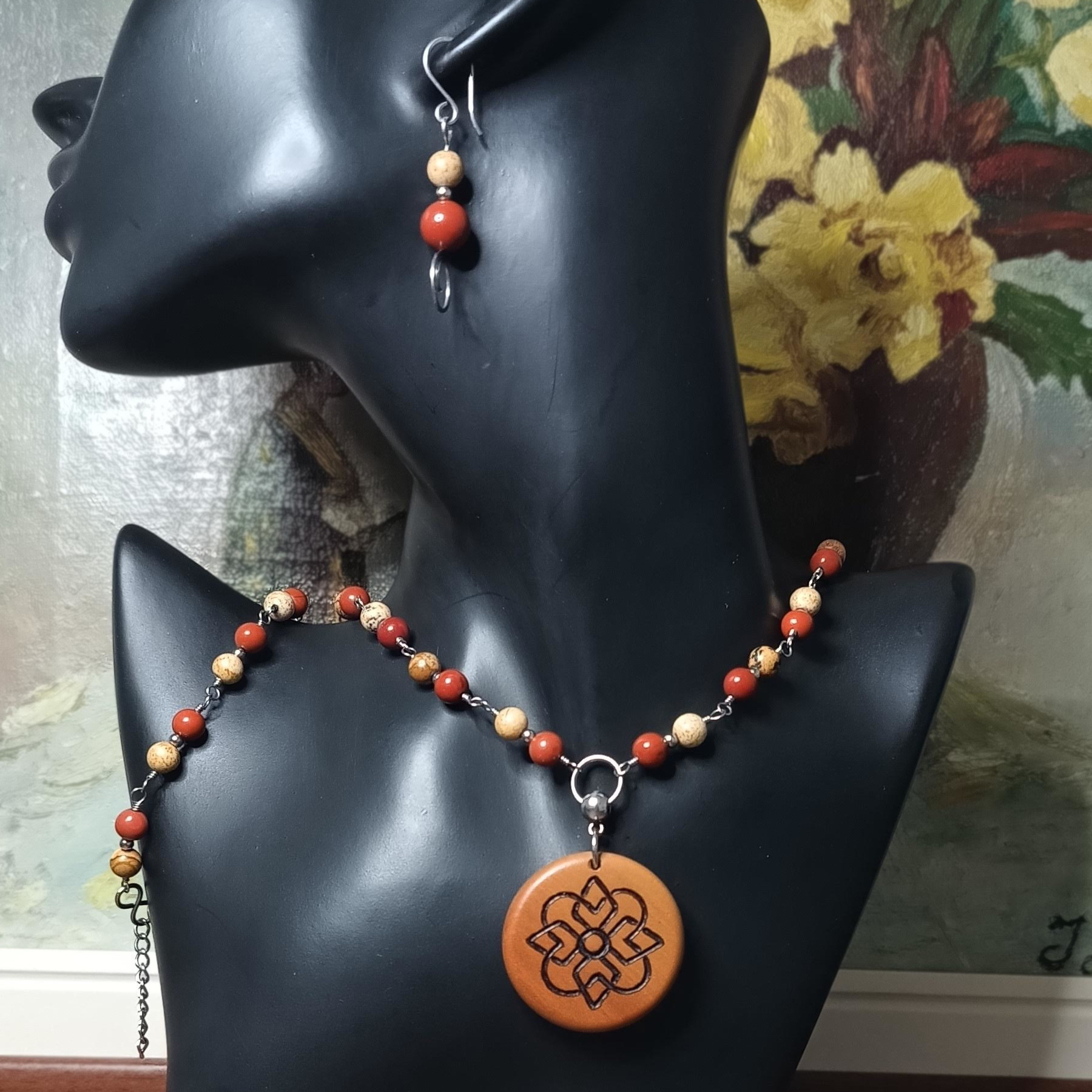 Ručna pirografija ističe prirodne linije drveta, dok se oko njega nadovezuju perle u toplim tonovima crvenog i pejzažnog jaspisa, a narukvica i naušnice prate isti ritam boja i zaokružuju sliku jeseni.