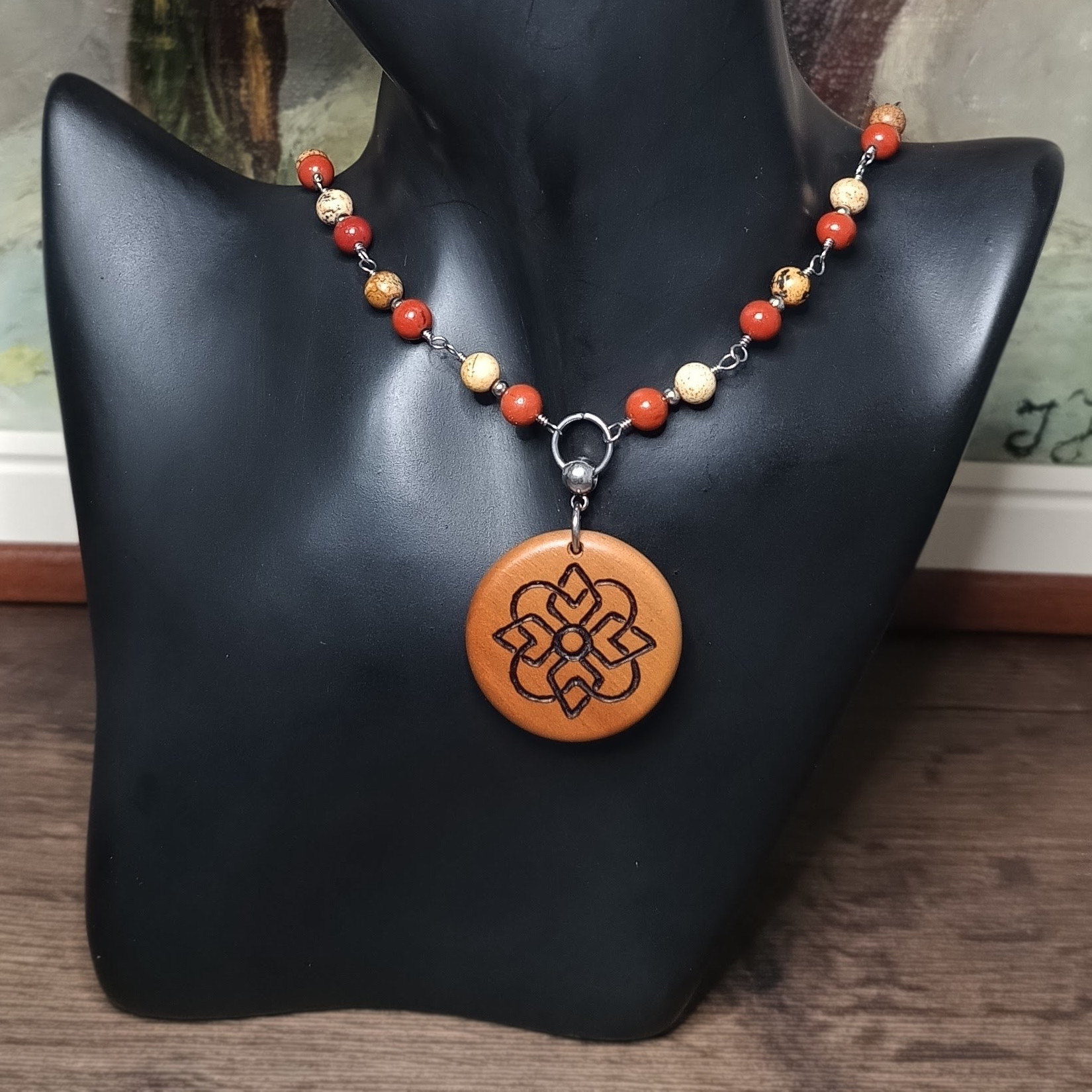Krupni drveni privezak sa motivom rozete donosi toplinu i posebnost ovoj ogrlici, dok perle jaspisa svojim veselim jesenjim bojama unose život i vedrinu. Spoj drveta i kamena čini je jedinstvenim komadom nakita koji odiše radošću i podseća na lepotu življenja.