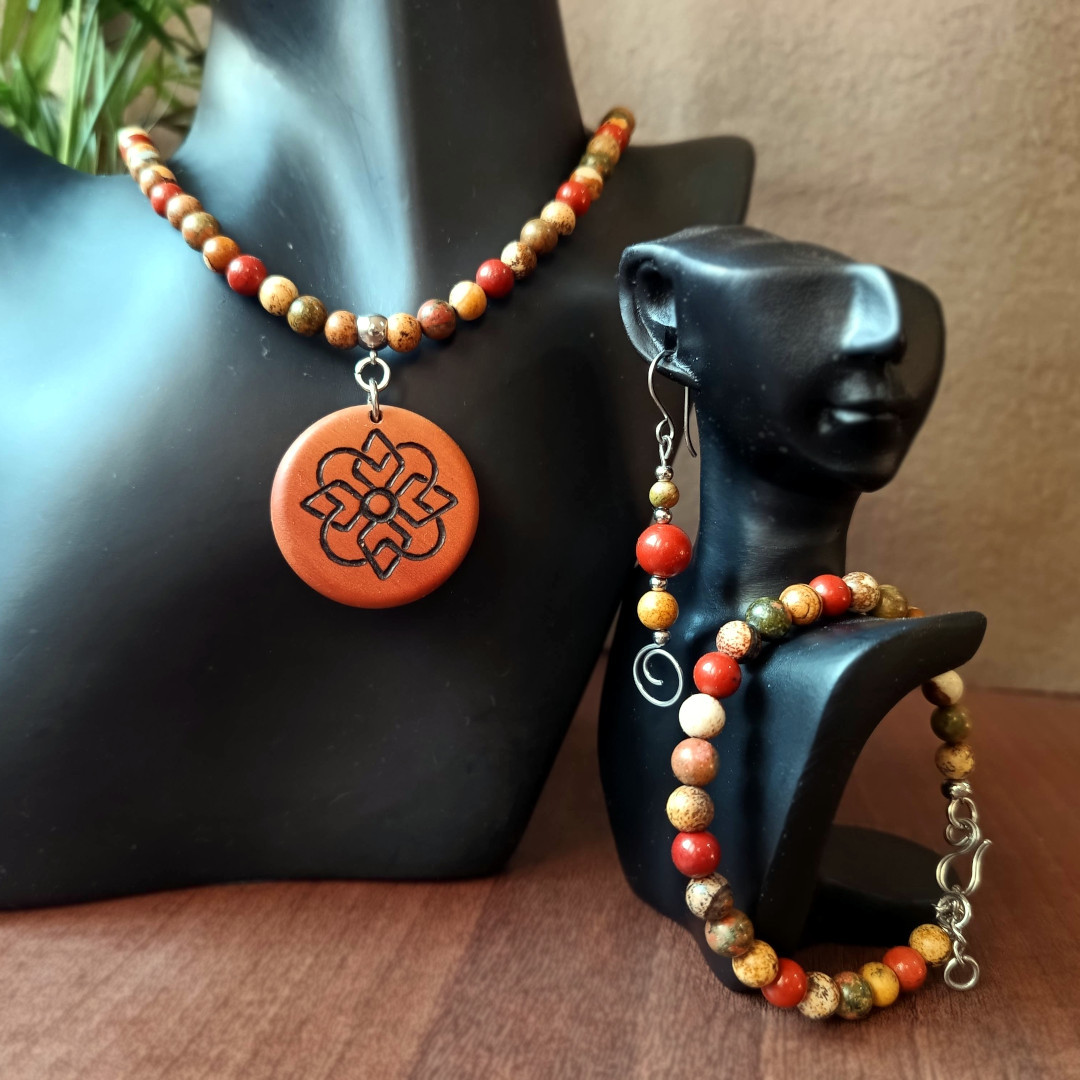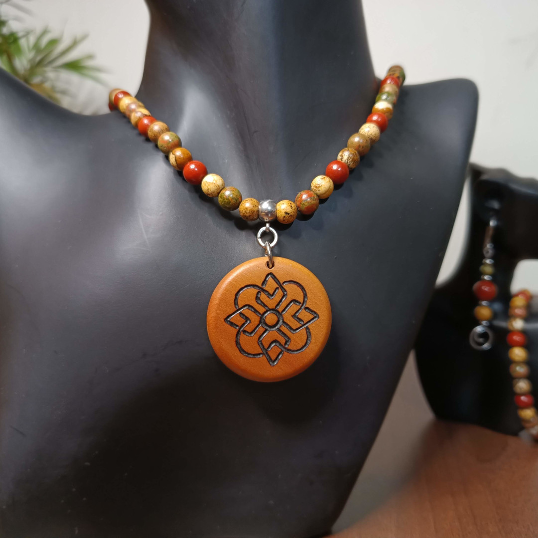 Komplet nakita od crvenog i pejzažnog jaspisa, unakita, drveta i nerđajućeg čelika