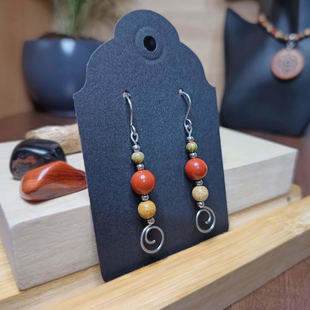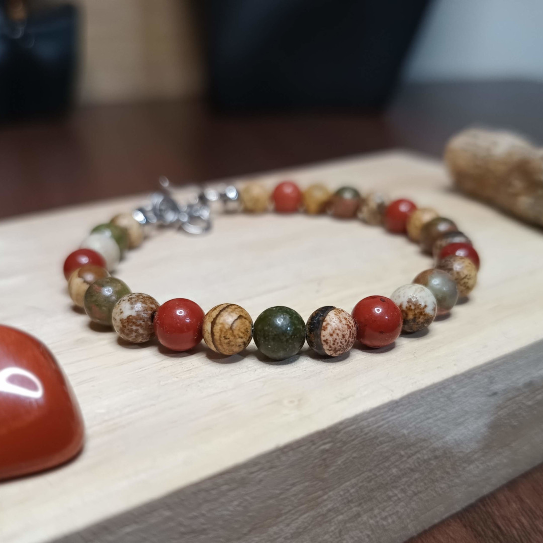 Jesenji mir je kolekcija u zemljanim, crvenim i zelenim tonovima, satkana od perli jaspisa i unakita spojenih u skladnu celinu. Svaki komad odiše prirodnošću, punoćom i životnošću, prizivajući mir i šarenilo jeseni.